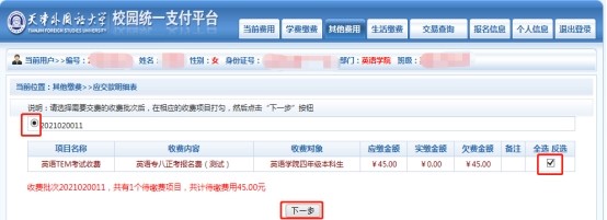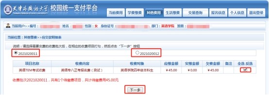 4. 确认“收费内容”、“收费对象”和“应缴金额”无误后,点击“全选”,再点击“下一步”。
