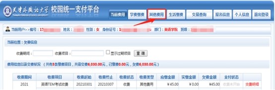 3. 登录后,首先点击“其他费用”,即可进入交费明细页面。