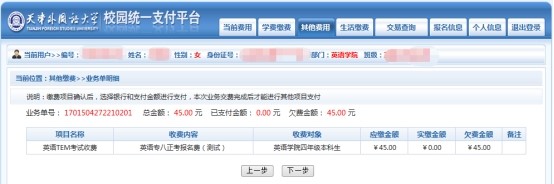 注意:英语学院部分毕业考生需要参加英语专四补考和英语专八正考,因此在该页面会出现两个批次的缴费,即英语专八正考报名费和英语专四补考报名费,请考生选择相应的批次进行缴费。页面如下: