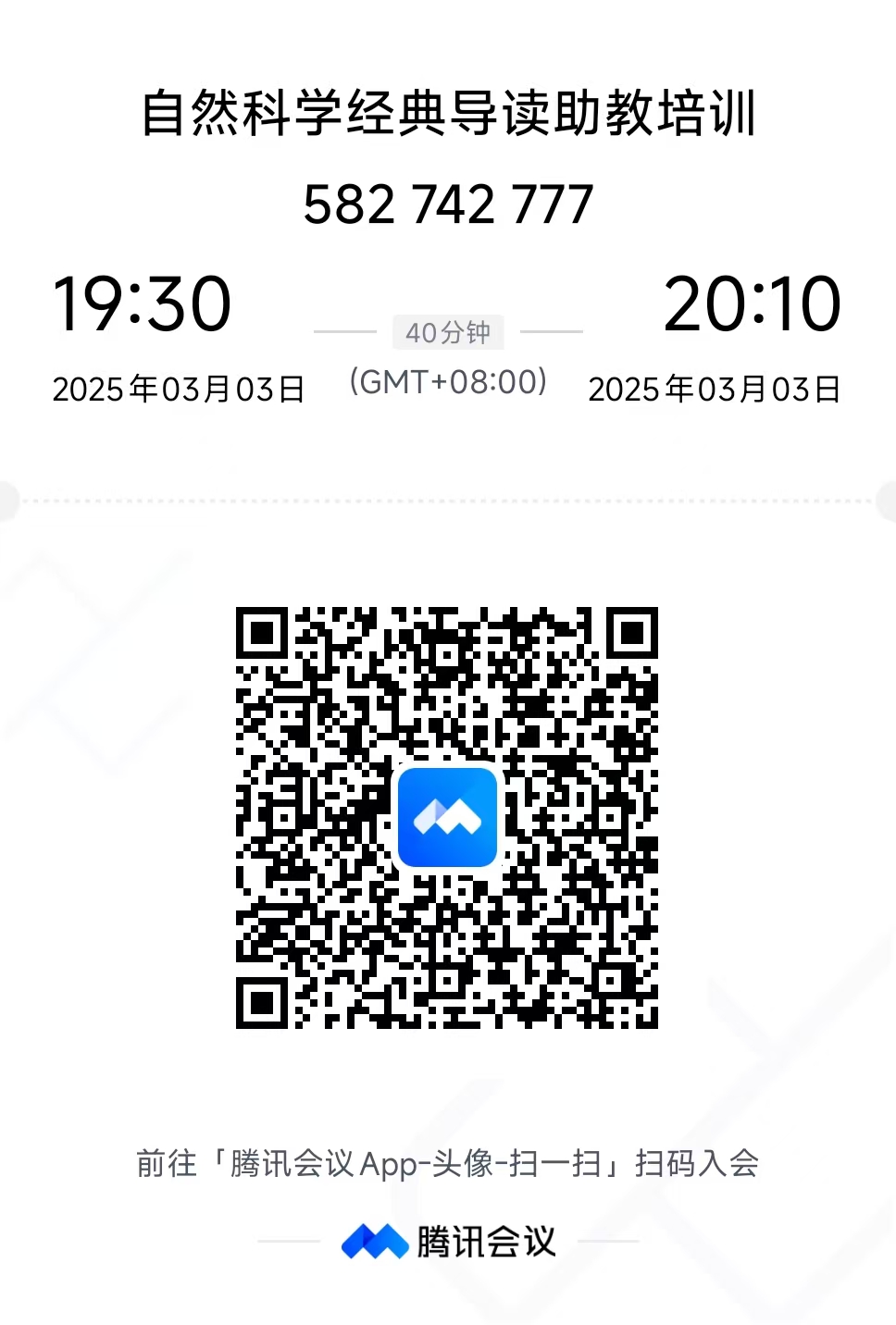 请录用为《自然科学经典导读》助教的研究生于3月3日晚7点半准时参加下方腾讯会议线上培训,无故不参加培训的不得上岗。《国家安全教育》助教培训事宜后续将在微信群内另行通知,请及时关注群消息。