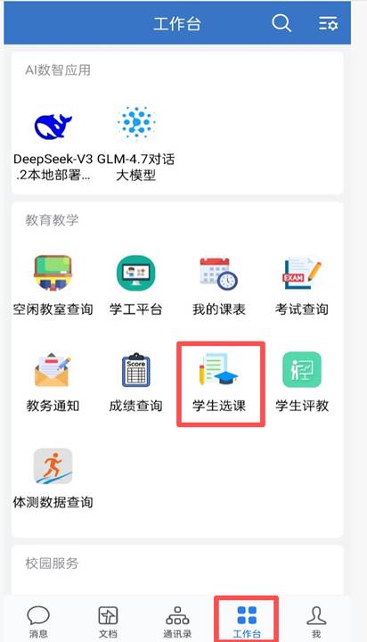 登录企业微信,选择工作台--->学生选课,进入选课页面