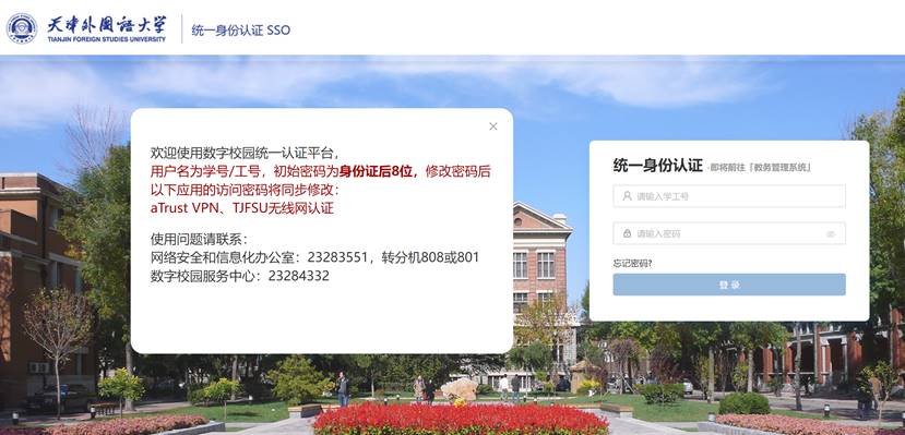 地址二(无需连接VPN):https://jwgl.tjfsu.edu.cn/直接登录教务系统。用户名为学号,密码为Tjfsu+证件号码后六位+@(注意首字母T大写)。
